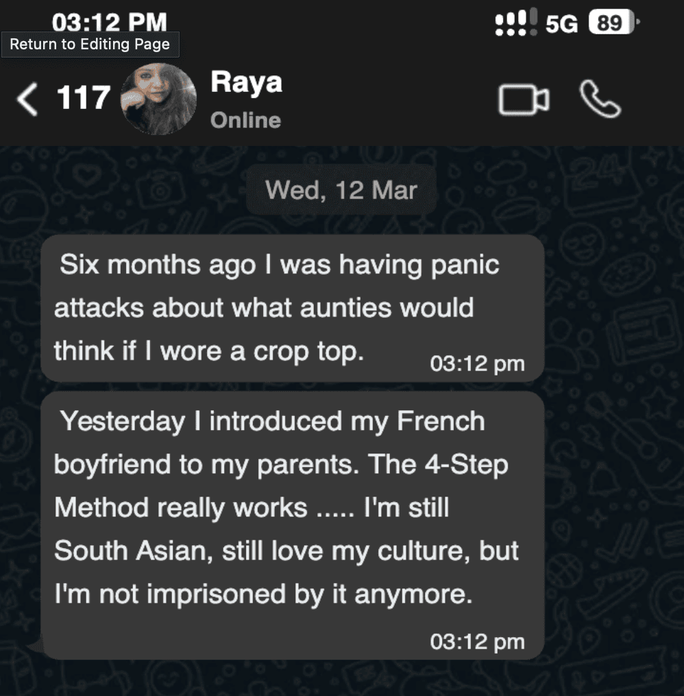 Step 3 - RECLAIM - We'll guide you through safe experiments to express your true self while keeping family connections, so you can stop exhausting yourself trying to be the "perfect" South Asian child
