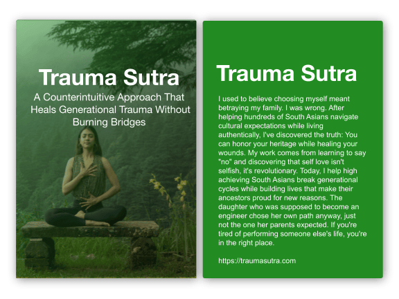 I have the benefit of years of personal healing work, studying neuroscience-backed trauma recovery methods, and helping countless South Asians navigate this exact journey.